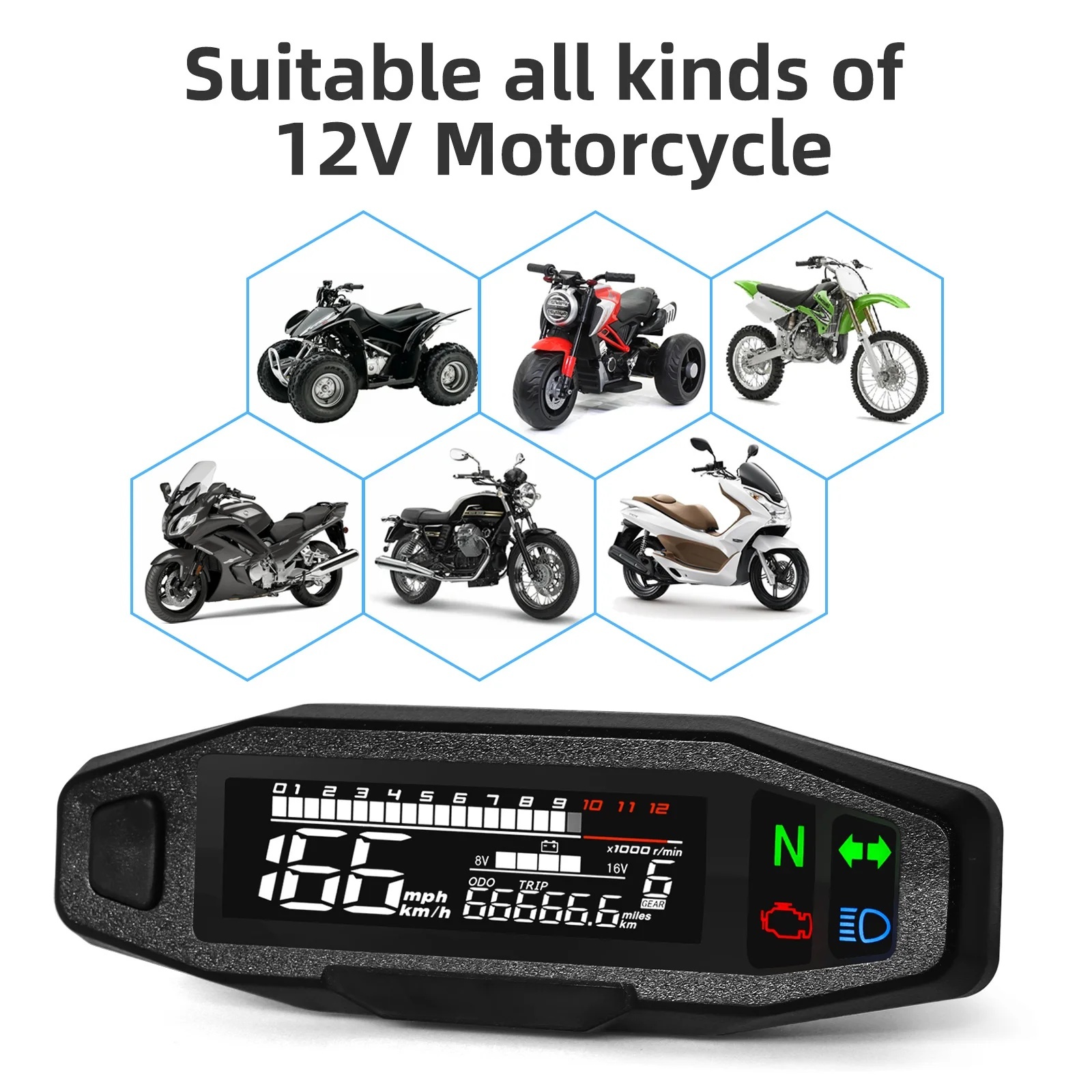 3.Verbeterde prestaties: Deze krachtige digitale elektronische snelheidsmeter biedt een breed toerentalbereik van 0-12000 om een nauwkeurige monitoring van de motorprestaties van uw motor te garanderen,en een spanning van DC12V ondersteunt een stabiel gebruik.